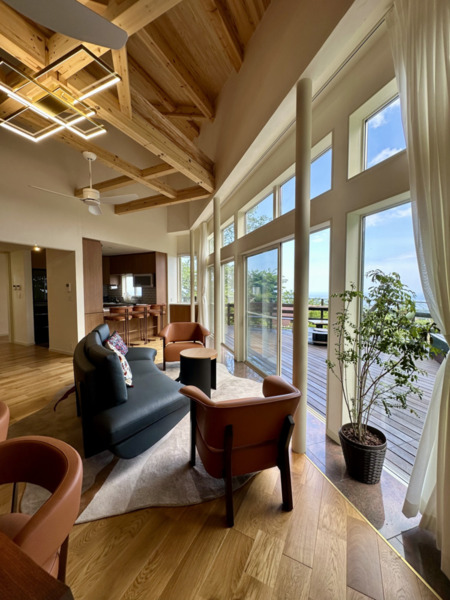 リビングに入った瞬間から、日常では味わえないオーシャンパノラマがお出迎え。プライベート温泉を24時間をご堪能いただけます。